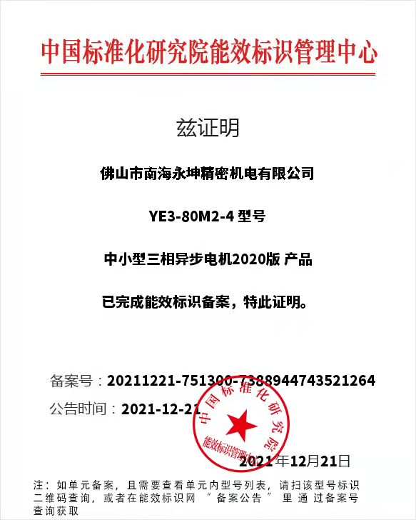 隨著國家強(qiáng)制能效標(biāo)準(zhǔn)啟動升級,重視能效約束也是企業(yè)提升競爭力的舉措之一。尤其是生產(chǎn)制造行業(yè)、節(jié)能減排、提升企業(yè)及設(shè)備的能效將是重中之重的任務(wù)了。佛山永坤電機(jī)公司一直以來都緊跟政府步伐、響應(yīng)國家號昭,不斷提升中小型三相異步電動機(jī)能效標(biāo)識。例如圖中展示的一款電動機(jī)YE3-80M2-4能效標(biāo)識則為2020年版。對于電動機(jī)能效標(biāo)號有著要求或是從事制造設(shè)備行業(yè)的,意在提升設(shè)備能效、提升設(shè)備附加值的,建議選用佛山永坤電機(jī)公司的新能效電動機(jī)。